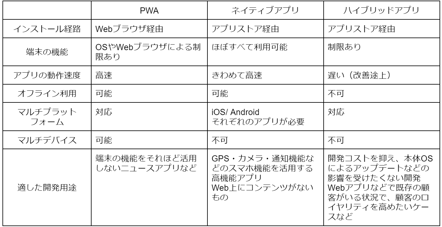 PWAとネイティブアプリ、ハイブリッドアプリの違い