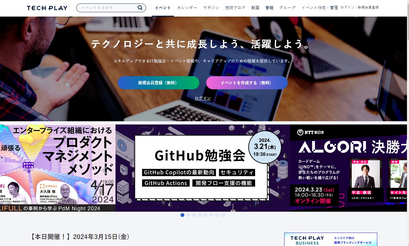 「TECH PLAY」は、Web・IT系の勉強会や交流会・カンファレンスなどの情報が掲載されている情報サイトです。